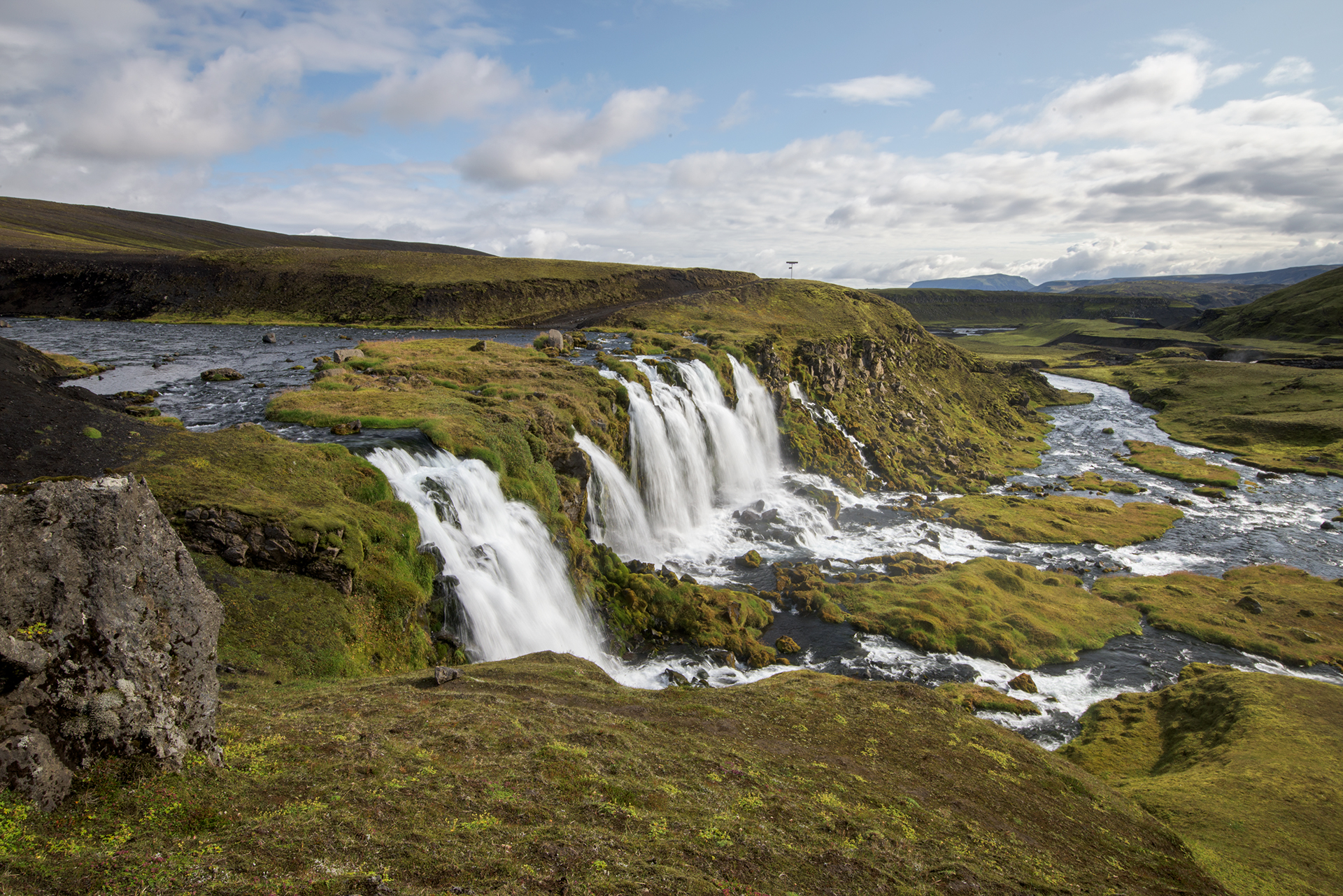 Even though it stands no more than 5 meters high, Bláfjallafoss is one of those beautiful waterfalls you can view up close from all sides. A ford on the F232 road crosses just above its edge. So, if you’ve ever seen a photo from Iceland with a car fording a river right next to a waterfall, it was likely taken here.