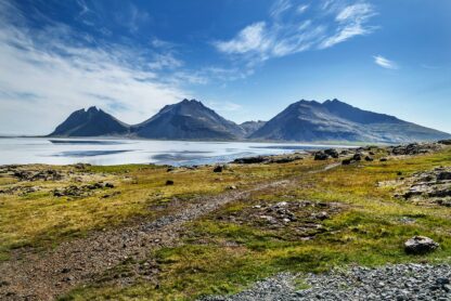 Varianta č. 2 je, že po Ring Road ještě projedete tunelem a až za ním odbočíte směrem k moři v tomto místě (GPS: 64.303902, -14.999481), potom pokračujte dál po štěrkové cestě k parkovišti na jejím konci. Odtamtud se můžete vydat k opuštěné vikingské vesnice přes pláž Stokksnes pěšky a to buď odvážně přes horské sedlo a nebo méně odvážně ale přitom pořád dost zajímavě podél pobřeží. Stále budete mít krásné výhledy na skály Vestrahornu. Pěší tůra vám bude trvat asi 3 hodiny a v tomto směru se žádná mýtná brána nenachází.
