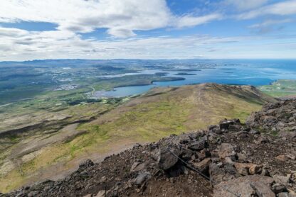 Vyjít na vrchol již dá trochu zabrat, neboť vycházíte téměř z úrovně moře, čeká vás tedy převýšení téměř 1000 metrů. Až ke známé vyhlídce Steinn je cesta po udržovaná a dobře schůdná. Nad Steinn přichází prudký a středně obtížný úsek, kdy se dostanete přes skalní blok Þverfellshorn, v několika místech jsou řetězy a hřebíky, ovšem s obratností a opatrností je úsek zvládnutelný. Následně už vás čekají jen 3 kilometry chůze po téměř ploché krajině do nejvyššího místa masivu Esja – Hábunga. Výledy z vrchní části jsou opravdu úžasné a kromě Reykjavíku a okolí můžete vidět například město Akranes, horu Háinhnúkur a ledovec Snæfellsjökull.