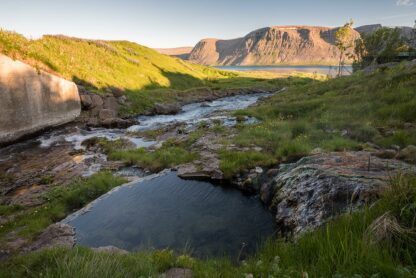 Reykjafjarðarlaug is another spot in Iceland where you can enjoy natural bathing in a small river and an artificially created, fairly large geothermal pool. It can become a welcome stop on your journey between Dynjandi waterfall and Látrabjarg cliff. The site offers a small building where you can change clothes.