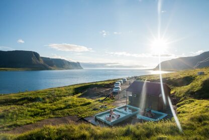 Reykjafjarðarlaug is located almost directly by road number 63. The natural pond is about 100 meters from the pool, away from the road.