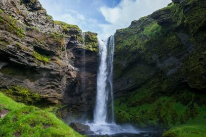Skógafoss – der Wasserfall im Wald. Wie viele Menschen wüssten wohl weniger über Island, wenn es diesen Wasserfall nicht gäbe? Touristen, Hochzeitsgesellschaften, Models, Selfie-Enthusiasten – es scheint, dass jeder diesen Wasserfall auf seinen Fotos haben möchte. Und das ist kein Wunder. Mit einer Höhe von 60 Metern und einer Breite von 20 Metern, dazu fast perfekt rechteckig, ist er ein wahrhaft beeindruckender Anblick. Wie viele isländische Wasserfälle zeigt auch dieser oft einen Regenbogen, aber Skógafoss bietet etwas Besonderes: Ein Doppelregenbogen ist hier häufiger zu sehen als ein einzelner.