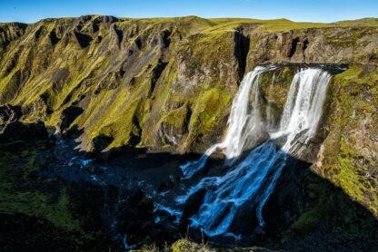 One of the most beautiful waterfalls in the Icelandic hinterland is Ófærufoss. An interesting fact is that it falls into the valley of the Eldgjá volcanic crater, the largest volcanic crater in the world, stretching 50 kilometers long and up to 600 meters wide. There are several hiking trails of varying difficulty nearby, and you can spend several hours there without getting bored.