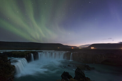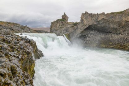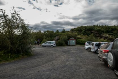 The parking area with restrooms by Lake Ljósavatn is located about 6 km west of Goðafoss waterfall.