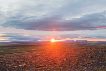 Viewing point on one of the hills in the Vatndalshólar system near Flóðið lake. There is a small parking lot with several information boards at the base of the hill, and a staircase leads up from there.