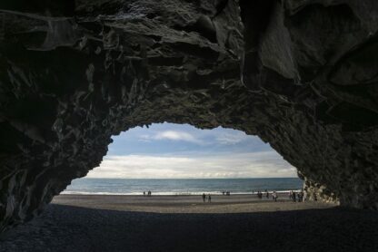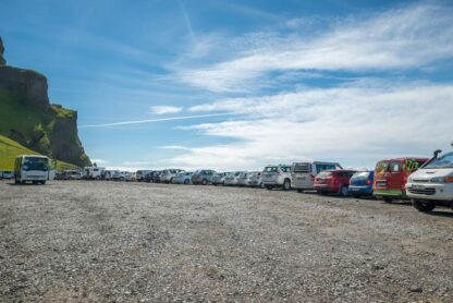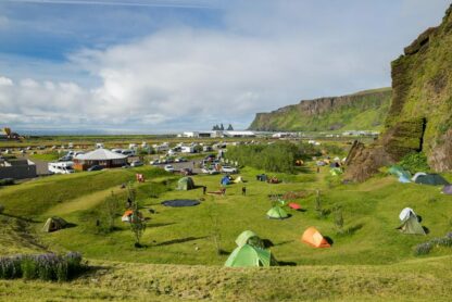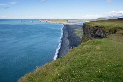 The black beach Víkurfjara is just a few steps away from the town of Vík and offers beautiful views of the Reynisdrangar rock formations. When moving around the beach, the same rules apply as on its more famous sister beach, Reynisfjara. The sea here is dangerous (which is why you won’t find a harbor here) and unpredictable, so never turn your back on it!